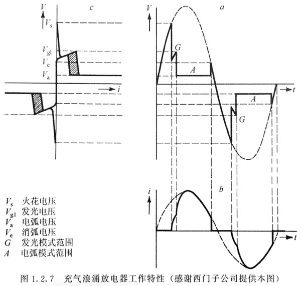 充氣浪涌放電器 大得多的瞬變電流可由各種氣體放電抑制器進(jìn)行處理。在這類抑制器中,兩個或更多的電極在密封的高壓情性氣體環(huán)境里被精確地設(shè)置了間距。當(dāng)放電器兩端電壓超過起弧電壓時,電極之間首先發(fā)生電離輝光放電。隨著電流的增大,會發(fā)生電弧放電,這就為所有的內(nèi)部電極之間提供了一條低阻抗的通道。在此模式下,放電器有一條電壓幾乎恒定的傳導(dǎo)路徑,典型的電弧壓降是25V,放電器的特性見圖1.2.7。注意到其特點是高起弧電壓和低電弧壓降。 當(dāng)沖擊電壓到來時,放電器電極僅維持很小的電壓,有效地短路電源適配器。此工作模式的內(nèi)部損耗很小,一個相當(dāng)小的器件也能承擔(dān)兒千安培的電流。使用這種類型的抑制器,保護(hù)作用不是把能量消耗在器件的內(nèi)部而是器件的短路作用,短路迫使瞬變能量消耗在電力線和濾波器的串聯(lián)電阻上。