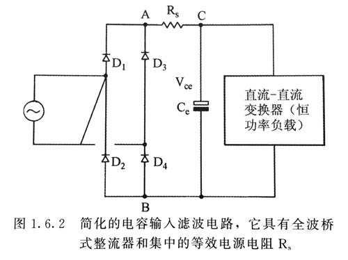 等效串聯電阻Rs 等效串聯電阻Rs,由所有串聯元件組成,包括出現于原邊供電充電器和儲能電容C5、C6之間的原邊充電器電阻。為了簡化分析,將各電阻集總為一個等效電阻Rs。為了進一步地減小峰值電流,可附加串聯電阻提供較合適的等效串聯電阻。可以看到整流電容輸入濾波器和儲能電路的性能在很大程度上取決于這種后面的較優等效串聯電阻。 圖所示為橋電路的一種簡化形式。在此簡化電路中,串聯的儲能電容C5和C6由等效電容C來代替,并且等效串聯電阻R,被置于橋式整流器的輸出端來進一步簡化分析。 在圖所示的實例中,等效串聯電阻由以下部分組成。