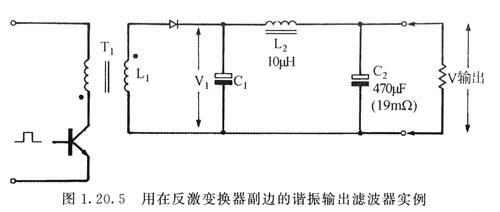 圖是一個其參數為30kHz、5V和10A且具有兩級LC輸出濾波器的反激變換器的典型輸出級。在反激變換器中,變壓器的電感與C1組成了第一級LC充電器濾波器,第二級濾波器是由L和C2組成。