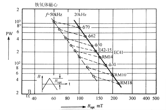 圖N27鐵氧體材料的較佳工作磁通密度振幅,作為輸出功率的函數(shù),以頻率和磁心尺寸為參數(shù)(經(jīng)西門子公司許可)