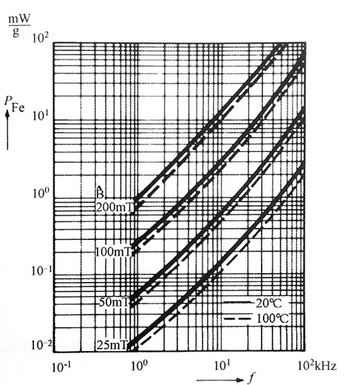 圖每克A16鐵氧體的磁心損耗是頻率的函數(shù),以峰值磁通密度為參數(shù)注:圖中曲線畫的是峰值磁通密度B,磁通密度變化范圍△B是2×B 圖表示一對工作于40kHz的A16鐵氧體EE55-55-21磁心,隨著匝數(shù)的變化其磁心損耗、銅損耗和總損耗的變化情況,峰值磁通密增加到了200mT。較小的總損耗產(chǎn)生在70mT附近。(對于每匝繞組,假設(shè)使用了較佳的磁心窗口面積和導(dǎo)線規(guī)格。)