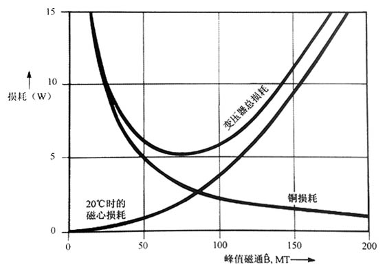 圖典型開關(guān)式變壓器在具有較佳繞制性能時,一對A16鐵氧體EE55-55-21磁心的磁心損耗,銅損耗和總損耗。損耗是峰值磁通密度的函數(shù)。注意到當變壓器電感(匝數(shù))為較佳時出現(xiàn)較小總損耗,此時磁心損耗是總損耗的44%
