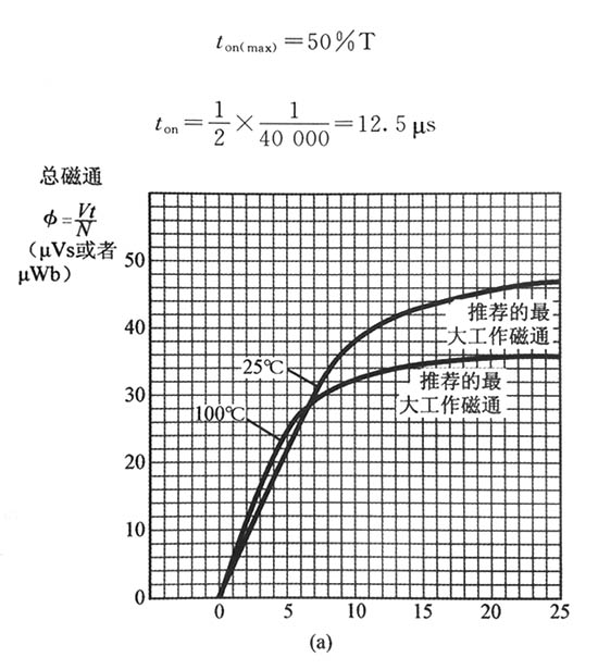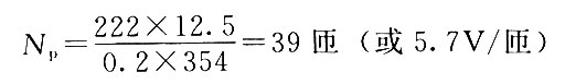步驟5,計算原邊匝數(shù) 導(dǎo)通期間加到變壓器原邊的電壓波形是矩形,可以使用伏秒方法(法拉第定理)來計算匝數(shù)。 在推挽變壓器中,兩個象限的B/H磁環(huán)都要使用,而在穩(wěn)態(tài)平衡條件下,磁通密度偏移在正半周內(nèi)將從一B變化到+B。 應(yīng)該注意圖2。13。4表示的是峰值磁通密度B,但假設(shè)損耗是對峰峰磁通密度偏移△B(2×B)而言的。對于較佳效率,選擇的B是100mT。因此,本例中峰峰變化(磁通偏移擺幅)△B=2×B或=200mT EE5-5-21的磁心面積是354mm2,原邊匝數(shù)由下式計算