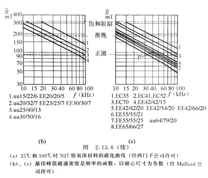 (a)25℃和100℃時N27鐵氧體材料的磁化曲線(經(jīng)西門子公司許可) (b)、(c)較佳峰值磁通密度是頻率的函數(shù),以磁心尺寸為參數(shù)