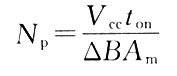 式中,Vcc=較小直流整流電壓; ton=較大導(dǎo)通時間,單位是μs △B=總磁通密度偏移,單位是T Am=較小磁極面積,單位是mm2。 因此