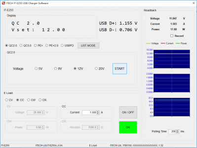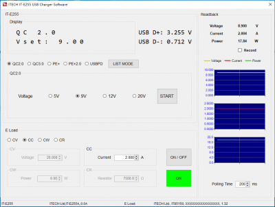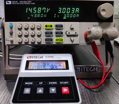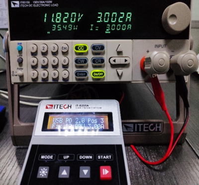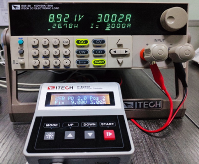 | 今年是USB 充電器爆發(fā)的一年。無論是手機、平板、還是筆記本電腦,越來越多的消費類電子產(chǎn)品都不約而同的用上了TYPE-C接口,支持USB PD充電協(xié)議。 一款快充充電器好不好,首當(dāng)其沖的肯定是兼容情況,其次是輸出帶載能力。 較近購買一款小米45W的PD充電器,同時兼容QC2.0、QC3.0快充協(xié)議。 市面上多數(shù)電子負(fù)載并不支持快充協(xié)議,而艾德克斯電子新出的IT-E255A快充控制盒卻可以搭配目前多數(shù)電子負(fù)載進(jìn)行快充協(xié)議的測試。 這個小小的快充控制盒不僅支持QC2.0/QC3.0/PE/PE2.0/USB PD,更重要的是竟然可以和艾德克斯的IT8500+系列的電子負(fù)載通信,設(shè)定負(fù)載的拉載模式和拉載值。 下面就和小伙伴們一起分享小米USB-C充電器的測試。 1.開始準(zhǔn)備階段 IT-E255A的輸入口有Mini-USB和TYPE-C 2個接口。 充電器插入口,IT-E255A連上電子負(fù)載,測試就可以開始嘍。 1.1 IT-E255A自動進(jìn)行充電器協(xié)議檢測,Type-C輸出口支持USB PD2.0 、QC3.0、QC2.0三種快充協(xié)議。 1.2 從IT-E255A顯示屏中可以看出,小米USBPD充電器的快充協(xié)議版本為2.0,支持5V/3A、9V/3A、12V/3A、15V/3A、20V/2.25A五個輸出檔位。 1.3 在5V/3A、9V/3A、12V/3A、15V/3A、20V/2.25A五個PD輸出檔位,分別拉載較大的電流,測試其在不同檔位下輸出的電壓和輸出功率。 ![]() 歐規(guī)充電器測試接線圖(小米充電器+ 艾德克斯IT-E255A + 艾德克斯IT85150) USB PD 2.O POS1 5V/3A ![]() USB PD 2.O POS2 9V/3A ![]() USB PD 2.O POS3 12V/3A ![]() USB PD 2.O POS4 15V/3A ![]() USB PD 2.O POS5 20V/2.25A ![]() 2.手動按鍵按下“Mode”,選擇QC3.0,點擊“START”,IT-E255A則可誘導(dǎo)小米USB-C充電器從5.0V開始以0.2V的步進(jìn)值步進(jìn),充電器可按照快充控制盒的設(shè)定值輸出。 2.1 在QC3.0模式下,誘導(dǎo)充電器輸出6.0V、7.0V、8.0V、9.0V,分別使用電子負(fù)載恒流模式拉載,測試其電壓、輸出功率。 ![]() 3. 如果不喜歡手動操作,還可以使用上位機軟件控制。 使用USB數(shù)據(jù)線將IT-E255A和計算機相連。下載相應(yīng)免安裝的上位機軟件,打開后就可以使用。 下面做了兩個測試:QC2.0 9.0V輸出: QC2.0 12.0V輸出: ![]() 操作清晰簡易,可以顯示拉載的電壓、電流、功率的波形曲線,自由控制電子負(fù)載, 另外還可以設(shè)置list自動測試,快速進(jìn)行判斷、OCP測試等。此外還可以下載到快充控制盒中,與電腦脫機使用,一鍵操作,非??旖?。