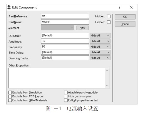為了驗證65W桌上型電源適配器濾波電容的效果,在原電路輸入基礎上將濾波電容C1改為100μF,輸入信號依然為15V、50Hz的交流信號,設置方法如圖所示。利用軟件圖表功能仿真out1端輸出波形,如圖所示。
