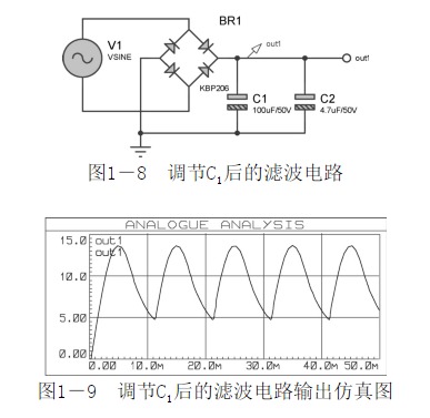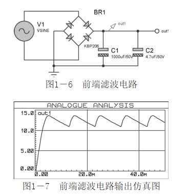 綜上所述,輸入的交流信號經整流電路整流,又經濾波電路,后面將穩定有效的電壓由out1端傳輸至穩壓電路模塊。可見,濾波電路在電路設計中是十分重要的。