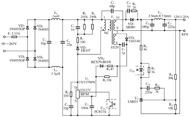 | 電源適配器打破了傳統的穩壓模式,它的調整元器件工作在開關狀態,即通過調整開關元器件的開關時間來實現穩壓。電源適配器具有體積小、重量輕、功耗小、穩壓范圍寬等特點,所以被廣泛地應用在各種電子產品中。電源適配器廠家玖琪給大家介紹15W、12V電源適配器應用電路,以使讀者對電源適配器有一個總體的認識和了解。 1.設計特點 圖所示電路具有以特點:設計簡單,成本低,元件數量少;空載功耗低,265V輸入時空載功耗小于100mW;效率高,90V輸入時效率大于81%;滿足CEC對帶載工作模式效率的要求(達到79%的效率,而標準要求的效率為73.5%);相對于EN55022B傳導EMI限值,EMI裕量大于10dBμV;簡單的初級側輸出過壓鎖存關斷電路可在故障狀態下保護負載;工頻漏電流小于10μA。 2.工作原理 圖所示的反激式電源設計采用了8腳DIP封裝的TNY279PN(U1),非常適合適配器的應用。U1的4個源極引腳分布在同一側,可通過嵌入一個小的金屬散熱片,使器件工作在外部環境溫度為40°C的密封適配器內。在每一個使能開關周期,U1內部的MOSFET導通,電流流過變壓器T1的初級繞組。當初級電流達到MOSFET的限流點時,控制器關斷MOSFET,變壓器T1中的能量被傳送到輸出端。肖特基二極管VD7和電容C8對輸出電壓進行整流和濾波。電感L3和電容C9用于衰減輸出的開關頻率紋波。電容C3用于選擇U1的標準限流點。初級鉗位電路(VD5、R1、C5、R5和R6)將峰值漏極電壓控制在內部MOSFET的700V擊穿電壓之下。電阻R1用于阻尼T1漏感引起的高頻振蕩。 ![]() 圖15W、12V電源適配器電路 U1內置的頻率抖動和E-ShieldTM技術只需使用簡單的EMI濾波就可以符合EN55022B的要求。電阻R2和C4組成RC緩沖電路以減小高頻EMI。 通過檢測變壓器輔助繞組電壓,可在初級側實現輸出過壓保護。如果U2失效造成主反饋開路時,一旦流進BP/M腳(通過VD8)的電流超過6.5mA,U1就鎖存。通過選擇VD8的參數使主輸出以及輔助輸出電壓在超過正常穩壓范圍時觸發OVP鎖存。一旦被觸發,重新上電就會使OVP鎖存復位。 為了減小空載功耗和提高輕載效率,變壓器的輔助偏置繞組通過電阻R3給U1供電。為了避免增加空載損耗或者OVP的誤觸發,正確選擇VD8的參數,使輸出電壓在超出正常穩壓范圍時才可導通。電阻R4阻止了過度的電流流進BP/M腳。VD1和VD3選用快速恢復二極管來減小低頻傳導EMI。 3.設計要點 在高壓、較大過載點條件下,較大漏極電壓小于650V。相應地調整R5、R6和C5的參數,避免使鉗位損耗太大(R5和R6的阻值小,C5的容量大),從而減少空載損耗。變壓器的參數見表。 表變壓器參數 ![]()