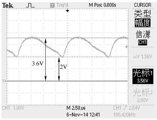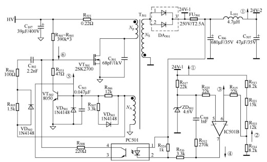 目前許多打印機(jī)使用自激式電源適配器,根據(jù)功能和打印方式的不同,打印機(jī)可分為針式打印機(jī)、票據(jù)打印機(jī)、噴墨打印機(jī)、激光打印機(jī)等多種。圖3-33為惠普HP1018激光打印機(jī)電源適配器原理圖,主要由市電交流輸入及轉(zhuǎn)換、定影系統(tǒng)供電、主電源適配器等電路構(gòu)成。各部分電路工作原理如下。![]() 1.市電輸入及轉(zhuǎn)換 電源適配器輸入電路是指高頻干擾抑制、整流和濾波電路。其作用是把電網(wǎng)的工頻交流電轉(zhuǎn)換為平滑的直流電,給電源適配器提供輸入電壓,并抑制和濾除輸入端的高頻雙向干擾。有關(guān)輸入電路各元器件的作用可參見第2章中的表2-3。 2.定影系統(tǒng)供電及控制 通電后,打印機(jī)CPU經(jīng)由接插件J201的19、21腳送入高電平,因J201的7腳為+5V(來自于主控板),VT102與VT103均導(dǎo)通。其中,VT102導(dǎo)通,經(jīng)光耦SSR101(3SF21)給雙向可控硅VT101(BCR5KM)提供觸發(fā)信號使其導(dǎo)通;VT103導(dǎo)通,繼電器RL101觸點(diǎn)吸合,此時市電通過接插件J101為陶瓷片供電加熱。當(dāng)加熱陶瓷片的溫度達(dá)到185℃左右時,接插件J201的19腳變?yōu)榈碗娖剑琕T102截止,VT101關(guān)斷,陶瓷片加熱停止,與此同時,微處理器發(fā)出指令使“準(zhǔn)備好”燈點(diǎn)亮。 另外,該機(jī)具有節(jié)能功能。如果在設(shè)定時間內(nèi)打印機(jī)仍未工作,則接插件J201的21腳變?yōu)榈碗娖剑琕T103截止,繼電器RL101觸點(diǎn)釋放,機(jī)器進(jìn)入待機(jī)狀態(tài)。二極管VD105反并聯(lián)于繼電器RL101供電線圈兩端,在VT103截止時吸收線圈瞬間感應(yīng)電壓,對VT103起保護(hù)作用。 雙向可控硅VT101主回路兩端并聯(lián)的SQ101是一個阻容串聯(lián)復(fù)合體,復(fù)合體電阻為120Ω,電容為0.1μF/AC275V。在可控硅關(guān)斷瞬間,阻容復(fù)合體吸收感性負(fù)載的瞬變高壓(也可以理解為“剩余能量”)保護(hù)可控硅。這種阻容復(fù)合體吸收電路在交流市電的可控硅供電系統(tǒng)中已經(jīng)成為必選。 3.主電源 該機(jī)是由功率管VT501(2SK2700是MOSFET)和開關(guān)變壓器T501為核心構(gòu)成的自激式電源適配器。 (1)開關(guān)管VT501的開關(guān)過程 輸入整流濾波電壓約為300V:一路經(jīng)保險電阻R523(0.22Ω)、T501主繞組NP加到開關(guān)管漏極(D);另一路經(jīng)R501~R503給VT501提供啟動電壓。輔助繞組NA經(jīng)阻容元件與開關(guān)管VT501組成振蕩電路,VT501是開關(guān)管兼振蕩管。高壓電容C501(680pF/1kV)并聯(lián)在VT501的漏—源極之間,用于抑制VT501關(guān)斷瞬間NP產(chǎn)生的浪涌電壓。 VT501導(dǎo)通時,NA同名端(黑圓圈)為正極性電壓:一方面經(jīng)R504、R505和C502送到功率管柵極加速其導(dǎo)通;另一方面經(jīng)R506給C503充電,C503兩端電壓約為0.6V時VT502開始導(dǎo)通,并聯(lián)于VT502發(fā)射結(jié)的電容C503兩端正電壓被鉗位。由于C503充電時間常數(shù)較大,故在VT501導(dǎo)通一段時間后VT502才導(dǎo)通,降低VT501柵極與源極之間的電壓,VT501漏極電流減小,變壓器所有繞組電壓極性反轉(zhuǎn)。NA同名端負(fù)極性的電壓一路經(jīng)R504、VD502和C502(VD502旁路R505)加到VT501柵極加速其截止;另一路經(jīng)R507和VD503給C503放電(R506阻值較大,被R507和VD503旁路),促使VT502退出導(dǎo)通,轉(zhuǎn)為截止。繼續(xù)放電約為-0.6V時VD501開始導(dǎo)通,此時電容C503兩端負(fù)電壓被VD501鉗位。 圖為某負(fù)載時以A點(diǎn)為參考零電位時測得的功率管柵極(G)電壓波形。可見,柵極電位(G)始終高于A點(diǎn)電位,振幅約為1.6V。 ![]() 由上述分析可知,VT501柵極通路電容C502充、放電的通路不同,VT502發(fā)射結(jié)并聯(lián)電容C503充、放電的通路也不同,它們均是充電時間常數(shù)大、充電慢,放電時間常數(shù)小、放電快。C502的充電時間設(shè)定了開關(guān)管VT501導(dǎo)通的較大脈沖寬度,在此脈寬之內(nèi)受控于脈寬調(diào)制管VT502;其充電慢、放電快有利于VT501快速截止。C503充電慢是為了滿足VT501具有較大導(dǎo)通脈沖寬度,放電快是便于進(jìn)入下一個控制周期。 (2)穩(wěn)壓控制 整流管DA501是共陰極(肖特基)二極管,F(xiàn)U501是延時型可恢復(fù)保險絲(防止輸出短路)。整流后的脈動電壓經(jīng)由C506、L101和C507組成的π形濾波器變成紋波很小的直流電。 穩(wěn)壓電路受光耦PC501和集成運(yùn)放IC501B控制。R517與ZD501產(chǎn)生4.6V基準(zhǔn)電壓,經(jīng)R525加到IC501B反相端(5腳),輸出電壓經(jīng)R513、R521、R522(9)和R514串聯(lián)產(chǎn)生采樣電壓,經(jīng)R515加到IC501B同相端(6腳)。由于某種原因?qū)е螺敵鲭妷荷撸瑒tIC501B同相端(6腳)電壓升高,輸出端(7腳)電壓隨之降低,光耦PC501光電二極管發(fā)光增強(qiáng)(導(dǎo)通電壓約為1V),光電晶體管的等效電阻減小。此時,VT501柵極正脈沖電壓經(jīng)R508、PC501對C503充電速度加快,VT502提前導(dǎo)通,VT501提前截止,占空比變小,輸出的電壓隨之下降,從而實(shí)現(xiàn)穩(wěn)壓控制。由于某種原因?qū)е庐?dāng)輸出電壓升高,有關(guān)節(jié)點(diǎn)電壓的變化趨勢如圖3-35所示中的①~⑥,即輸出電壓意外上升后,經(jīng)一系列反饋,后面導(dǎo)致占空比減小,從而保持輸出電壓穩(wěn)定。 ![]() 由上述工作原理分析,則輸出電壓UO為 ![]() 式中,4.6V為穩(wěn)壓二極管ZD501的參數(shù)。代入原理圖中有關(guān)