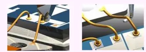 焊線時,以晶粒上之接點為焊點,內(nèi)引腳上之接點為第二焊點。先將金線之端點燒成小球,再將小球壓焊在焊點上。接著依設計好之路徑拉金線,將金線壓焊在第二點上完成一條金線之焊線動作。