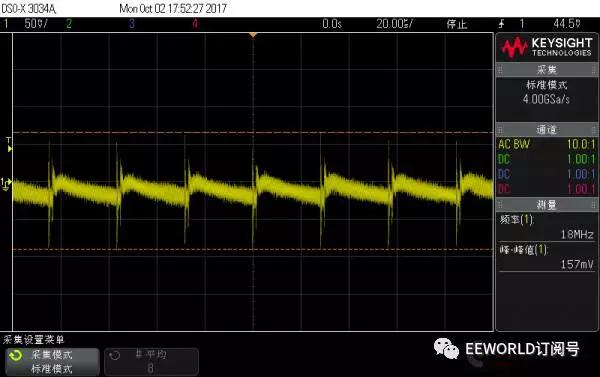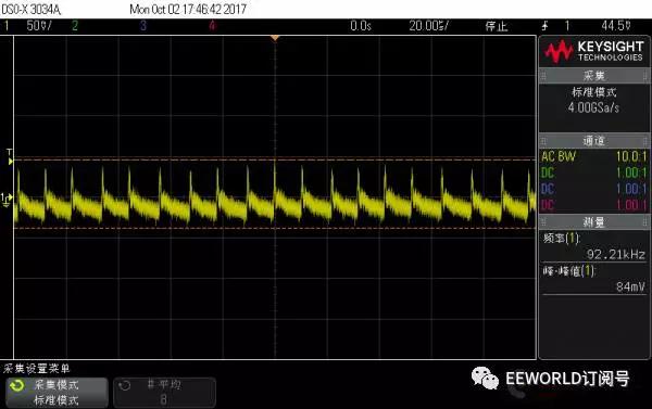 上面兩圖對比:隨著電流增大,開關頻率變大,但是紋波峰峰值反而有所下降,不過都在120mV以上 Apple 10W 充電器 1A 帶載波形