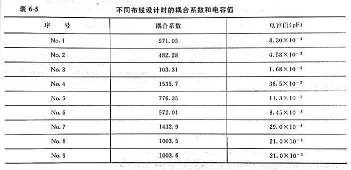 表6-5列出了9種不同的布線設計,分別給出了相圖6-18耦合系數與電容的關系應的耦合系數和電容值計算結果?比較這些結果可以發現,印制導線的大小?形狀和相對位置都會影響它們之間的耦合系數和電容值?為了更清楚地反映兩者的關系,把耦合系數和電容值繪入同一張圖中并進行線性回歸分析,如圖6-18所示?其相關系數為0.98,表明耦合系數能夠很好地反映導線間的耦合程度?依據耦合系數進行布線是可行的?
