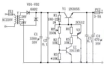 | 1、3~25V電壓可調(diào)穩(wěn)壓電路圖 此穩(wěn)壓電源適配器可調(diào)范圍在3.5V~25V之間任意調(diào)節(jié),輸出電流大,并采用可調(diào)穩(wěn)壓管式電路,從而得到滿意平穩(wěn)的輸出電壓。 工作原理:經(jīng)整流濾波后直流電壓由R1提供給調(diào)整管的基極,使調(diào)整管導(dǎo)通,在V1導(dǎo)通時(shí)電壓經(jīng)過(guò)RP、R2使V2導(dǎo)通,接著V3也導(dǎo)通,這時(shí)V1、V2、 V3的發(fā)射極和集電極電壓不再變化(其作用完全與穩(wěn)壓管一樣)。 調(diào)節(jié)RP,可得到平穩(wěn)的輸出電壓,R1、RP、R2與R3比值決定本電路輸出的電壓值。 元器件選擇:變壓器T選用80W~100W,輸入AC220V,輸出雙繞組AC28V。FU1選用1A,F(xiàn)U2選用3A~5A。 VD1、VD2選用 6A02。RP選用1W左右普通電位器,阻值為250K~330K,C1選用3300μF/35V電解電容,C2、C3選用0.1μF獨(dú)石電容,C4選用 470μF/35V電解電容。 R1選用180~220Ω/0.1W~1W,R2、R4、R5選用10KΩ、1/8W。V1選用2N3055,V2選用 3DG180或2SC3953,V3選用3CG12或3CG80 ![]() 2、10A3~15V穩(wěn)壓可調(diào)電源電路圖 無(wú)論檢修電腦還是電子制作都離不開(kāi)穩(wěn)壓電源,下面介紹一款直流電壓從3V到15V連續(xù)可調(diào)的穩(wěn)壓電源,較大電流可達(dá)10A,該電路用了具有溫度補(bǔ)償特性的,高精度的標(biāo)準(zhǔn)電壓源集成電路TL431,使穩(wěn)壓精度更高,如果沒(méi)有特殊要求,基本能滿足正常維修使用,電路見(jiàn)下圖。 ![]() 其工作原理分兩部分,第一部分是一路固定的5V1.5A穩(wěn)壓電源電路。第二部分是另一路由3至15V連續(xù)可調(diào)的高精度大電流穩(wěn)壓電路。第一路的電路非常簡(jiǎn)單,由變壓器次級(jí)8V交流電壓通過(guò)硅橋QL1整流后的直流電壓經(jīng)C1電解電容濾波后,再由5V三端穩(wěn)壓塊LM7805不用作任何調(diào)整就可在輸出端產(chǎn)生固定的5V1A穩(wěn)壓電源,這個(gè)電源適配器在檢修電腦板時(shí)完全可以當(dāng)作內(nèi)部電源使用。 第二部分與普通串聯(lián)型穩(wěn)壓電源基本相同,所不同的是使用了具有溫度補(bǔ)償特性的,高精度的標(biāo)準(zhǔn)電壓源集成電路TL431,所以使電路簡(jiǎn)化,成本降低,而穩(wěn)壓性能卻很高。 圖中電阻R4,穩(wěn)壓管TL431,電位器R3組成一個(gè)連續(xù)可調(diào)得恒壓源,為BG2基極提供基準(zhǔn)電壓,穩(wěn)壓管TL431的穩(wěn)壓值連續(xù)可調(diào),這個(gè)穩(wěn)壓值決定了穩(wěn)壓電源的較大輸出電壓,如果你想把可調(diào)電壓范圍擴(kuò)大,可以改變R4 和R3的電阻值,當(dāng)然變壓器的次級(jí)電壓也要提高。變壓器的功率可根據(jù)輸出電流靈活掌握,次級(jí)電壓15V左右。
