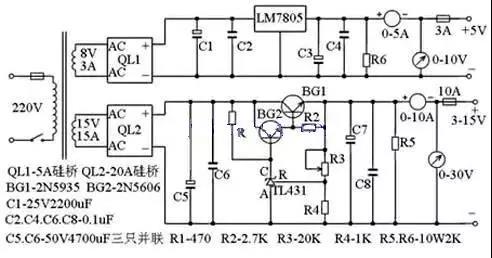 橋式整流用的整流管QL用15-20A硅橋,結(jié)構(gòu)緊湊,中間有固定螺絲,可以直接固定在機(jī)殼的鋁板上,有利散熱。調(diào)整管用的是大電流NPN型金屬殼硅管,由于它的發(fā)熱量很大,如果機(jī)箱允許,盡量購(gòu)買大的散熱片,擴(kuò)大散熱面積,如果不需要大電流,也可以換用功率小一點(diǎn)的硅管,這樣可以做的體積小一些。濾波用50V4700uF電解電容C5和C7分別用三只并聯(lián),使大電流輸出更穩(wěn)定,另外這個(gè)電容要買體積相對(duì)大一點(diǎn)的,那些體積較小的同樣標(biāo)注50V4700uF盡量不用,當(dāng)遇到電壓波動(dòng)頻繁,或長(zhǎng)時(shí)間不用,容易失效。