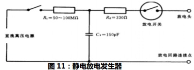 ESD 的模擬: 圖 11 和圖 12 分別給出了 ESD 發生器的基本線路和放電電流的波形。放電線路中的儲能電容 CS代表人體電容,現公認 150pF 比較合適。放電電阻 Rd為330? ,用以代表手握鑰匙或其他金屬工具的人體電阻。現已證明,用這種放電狀態來體現人體放電的模型是足夠嚴酷的。