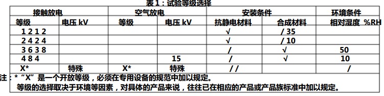 試驗等級及其選擇: 試驗電平以較切合實際的安裝環境和條件來選擇,表 1 提供了一個指導原則。表1 同時也給出了靜電放電試驗等級的優先選擇范圍,試驗應滿足該表所列的較低等級。表 1:試驗等級選擇