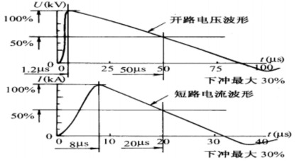 例如:對(duì)交流電源端口,通常采用的是 1.2/50μs (8/20μs)組合波信號(hào)發(fā)生器;對(duì)電信端口,通常采用的是 10/700μs 的符合 CCITT 要求的試驗(yàn)信號(hào)發(fā)生器。浪涌(沖擊)波形見圖 17 所示。