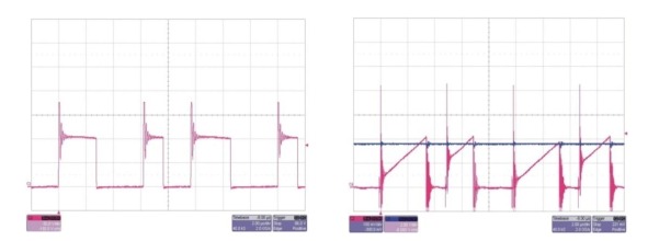 圖 2 兩種常見的電流模式噪聲問題 圖 2 顯示了電流斜坡存在的一些問 題。第一幅圖顯示了上升邊沿峰值和隨后 產(chǎn)生的電流斜坡。比較器(根據(jù)其不同速度) 具 有 兩 個 電 壓 結(jié) 點 (potential trip points),結(jié)果是無序控制運行,聽起來更 像是煎熏肉的聲音。 利用控制 IC 中的上升邊沿消隱可 以很好地解決這一問題,其忽略了電流波 形的較初部分。波形的高頻濾波也有助于 解決該問題。同樣也要將電容器盡可能近 地靠近控制 IC 放臵。正如這兩種波形表 現(xiàn)出來的那樣,另一種常見的問題是次諧 波振蕩。這種寬-窄驅(qū)動波形表現(xiàn)為非充 分斜率補償。向當前斜坡增加更多的電壓 斜坡便可以解決該問題。盡管您已經(jīng)相當 仔細地設計了電源布局,但是您的原型電 源還是存在噪聲。這該怎么辦呢?首先, 您要確定消除不穩(wěn)定因素的環(huán)路響應不 存在問題。有趣的是,噪聲問題可能會看 起來像是電源交叉頻率上的不穩(wěn)定。但真 正的情況是該環(huán)路正以其較快響應速度 糾出注入誤差。同樣,較佳方法是識別出噪聲正被注入下列三個地方之一:誤差放 大器、參考電壓或斜坡。您只需分步解決 便可!第一步是檢查節(jié)點,看斜坡中是否 存在明顯的非線性,或者誤差放大器輸出 中是否存在高頻率變化。如果檢查后沒有 發(fā)現(xiàn)任何問題,那么就將誤差放大器從電 路中取出,并用一個清潔的電壓源加以代 替。這樣您應該就能夠改變該電壓源的輸 出,以平穩(wěn)地改變電源輸出。如果這樣做 奏效的話,那么您就已經(jīng)將問題范圍縮小 至參考電壓和誤差放大器了。 有時,控制 IC 中的參考電壓易受開 關波形的影響。利用添加更多(或適當)的 旁路可能會使這種狀況得到改善。另外, 使用柵極驅(qū)動電阻來減緩開關波形也可 能會有助于解決這一問題。如果問題出在 誤差放大器上,那么降低補償組件阻抗會 有所幫助,因為這樣降低了注入信號的振 幅。如果所有這些方法都不奏效,那么就 從印刷電路板將誤差放大器節(jié)點去除。對 補償組件進行架空布線 (air wiring) 可 以幫助我們識別出哪里有問題。