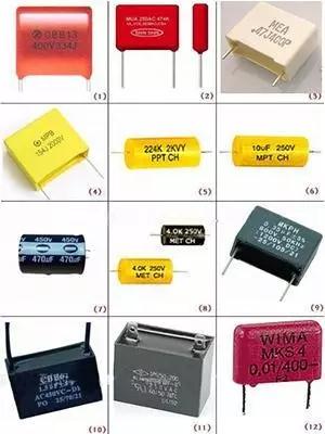 圖1是膽電容;圖2是燈具電容器;圖3是MKPH電容;圖4是MET電容;圖5、圖10是PEI電容;圖6是膽貼片電容;圖7是MPE電容;圖8是貼片電容;圖11是軸向電解電容器;圖12是MPP電容。
