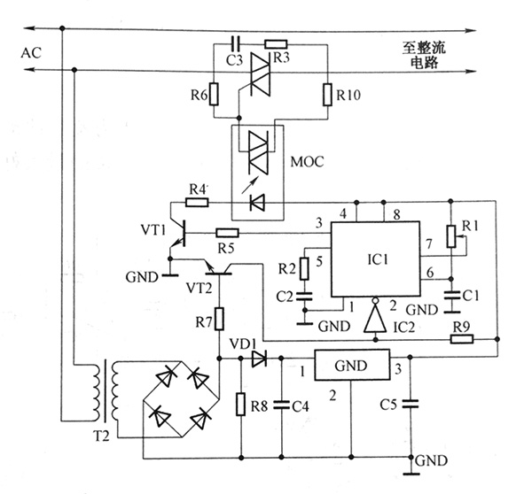過零觸發(fā)的光耦可控硅與雙向可控硅構成的電路 該電路如圖2-64所示?集成穩(wěn)壓器輸出穩(wěn)定的5V電源適配器電壓,為軟啟動電路提供電源適配器電壓晶體管VT?反相器IC2構成過零觸發(fā)電路,1Cl555構成單穩(wěn)態(tài)觸發(fā)器,R1·Cl為定時周期?但因5端~1端接有延遲電路R2?C2,所以555是逐步達到滿周期的?當電網電壓過零時,晶體管VT1截止,反相器IC2輸出低電平,啟動定時電路555工作,軟啟動延遲時間由時間常數R1C1及R2C2共同決定?