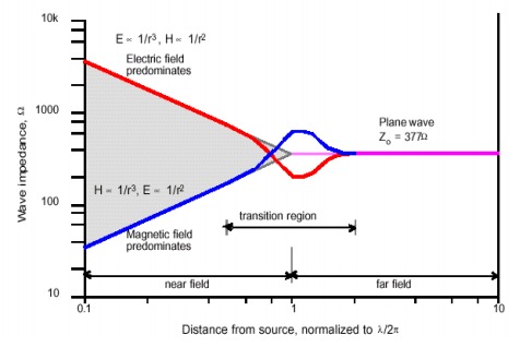 在遠(yuǎn)場區(qū)電場和磁場方向垂直并且都和傳播方向垂直稱為平面波,電場和磁場的比值為固定值,為 Zo=120∏=377 歐。下圖為波阻抗與距離的關(guān)系。