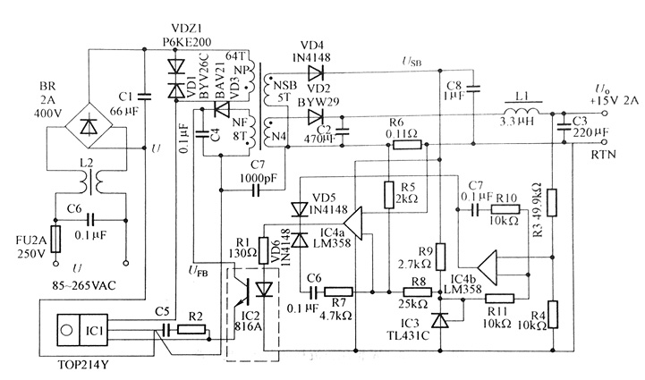 IC4a的同相輸入端接電流檢測信號UR6,反相輸入端接分壓器電壓Ufy?分壓器是由R5?R8和TL431C構(gòu)成的?IC4a在將UB6與UFy進行比較之后,輸出誤差。信號U,再通過VD5和R1變成電流信號,流入光耦中的LED,進而控制TOP214Y的占空比,使電源的輸出電流Io在恒流區(qū)內(nèi)維持恒定?顯然,VD5和VD6就相當于一個“或門”?