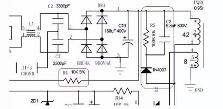 紅線圈起的電阻為IC的高壓啟動(dòng)電阻, 電阻阻值的選擇由IC特性決定。