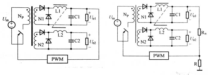 圖4-56耦合電感式多路輸圖變器原理圖 圖47電壓加權(quán)反饋式多路輸出質(zhì)器原理圖 這種電源適配器變換器的優(yōu)點(diǎn)主要是變換器輸出支路的整體穩(wěn)壓精度有所提高,電源適配器電路結(jié)構(gòu)比較簡(jiǎn)單,輸出電壓較低可達(dá)到5V電源適配器左右;缺點(diǎn)主要是由于反饋信號(hào)是每路輸出的加權(quán)和,因此所有支路的輸出均無(wú)法得到準(zhǔn)確調(diào)節(jié),它只是通過(guò)控制加權(quán)系數(shù)改變輸出誤差在各支路的分配比例,而不能消除誤差,此例中,N=2.M=1,仍然無(wú)法使每條輸出支路都得到精確調(diào)節(jié)