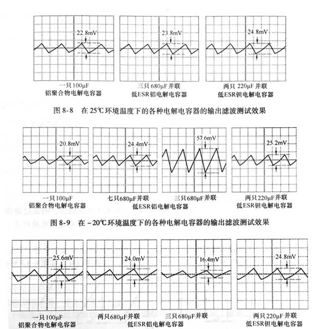 在不同的環(huán)境溫度下的測試結(jié)果分別為圖所示? 從測試結(jié)果看,在開關(guān)頻率為200kHz時,在常溫環(huán)境下,一只100μF的鋁聚合物電解電容器的濾波效果稍好于三只680μF的低ESR鋁電解電容器;稍好于兩只220μF低ESR鋁電解電容器?而在-20℃的環(huán)境下同樣的100μF鋁聚合物電解電容器的濾波效果明顯好于3只680μF低ESR鋁電解電容器,即使選用7只680μF低ESR鋁電解電容器,其效果才能接近100uF鋁聚合物電解電容器,但是還是差一些(差3.6mV,接近18%);稍好于兩只220μF低ESR電解電容器?這表明鋁電解電容器的低溫性能很差,而鉭電解電容器的低溫性能比鋁電解電容器好得多?在70℃環(huán)境溫度下兩只680uF就好于一只100μF鋁聚合物電解電容器;兩只220μF鉭電解電容器與鋁聚合物電解電容器基本相同?實(shí)驗(yàn)結(jié)果表明,鋁電解電容器的性能隨溫度變化非常大,高溫時的性能非常好,常溫特性一般,低溫特性極差。