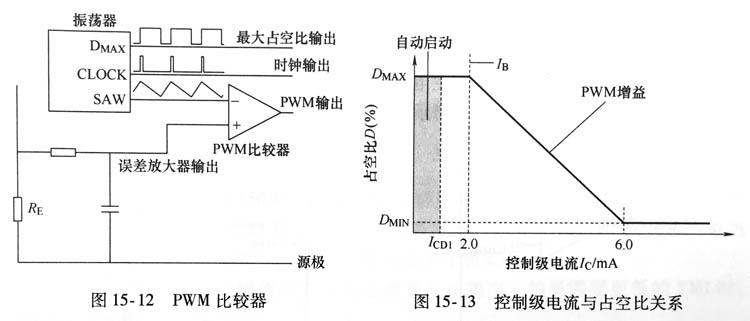 從圖15-13中可以看到:控制極電流小于2mA時,占空比為較大狀態(tài)?在控制級電流小于1m1時為自動啟動狀態(tài)? 控制極電流為2-6mA期間,占空比隨控制極電流的上升而線性下降,到控制極電流為6mA時達(dá)到較小占空比狀態(tài),并不隨控制級電流增加?