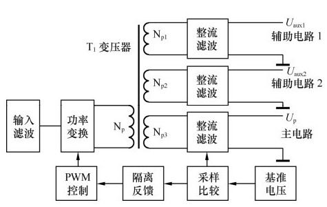 從圖可以看到,真正形成閉環控制的只有主電路(Up),其他的Uaux1、Uaux2等輔助電路都處于失控狀態。由控制理論可知,只有Up無論輸入、輸出如何變動(包括電壓變動、負載變動等),在閉環的反饋控制作用下都能保證相當高的精度(一般優于0.5%),也就是說Up在很大程度上只取決于基準電壓和采樣比例。對Uaux1、Uaux2而言,其精度主要依賴以下幾個方面。