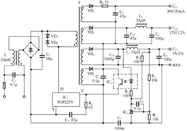 根據上述原則設計的多路輸出式25W電源適配器電路如圖9-2所示。該電路采用一片TOP223Y型三端單片電源適配器芯片,交流輸入電壓的范圍是85~265V。高頻變壓器的次級有3個獨立繞組,僅在主輸出端(±5V)設計了帶TL431的光耦反饋電路。多路輸出式電源適配器有以下兩種工作方式。