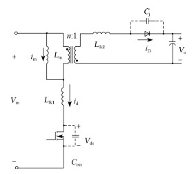 | 隨著世界范圍內對節能和環保的日益重視,使得電源行業對電源適配器的工作能效和待機損耗的要求不斷增加,本文以15W繼續式反激電源適配器為研究背景。設計一個完全能量傳遞反激式電源適配器 斷續模式的反激電源適配器設計,其技術指標如下: 輸入電壓:41~57VDC; 輸出電壓:17V; 輸出電流:0.8A; 額定效率:ηN≥80%; 開關頻率:f=82kHz。 斷續模式反激電源適配器電路設計 反激電源適配器電源適配器的電路原理圖如圖所示。主控芯片采用電流型控制芯片UC3843;輸入輸出電氣隔離;主控芯片UC3843與輸入為同一參考,這樣便于驅動、電流采樣和芯片的啟動;電壓誤差放大器與輸出為同一參考,誤差放大后的信號由光耦合器隔離傳回輸入側;芯片啟動以后供電由主電路的一個輔助繞組提供;變壓器原邊繞組加RCD吸收回路;輸出加LED指示燈。 ![]() 圖反激電源適配器電路原理圖 反激電源適配器RCD緩沖器的設計 圖是考慮寄生元件時反激式電源適配器的結構,這些寄生元件有:原邊和副邊的漏感Llk1和Llk2,MOSFET輸出電容Coss,二次側二極管結電容Cj。 ![]() 圖帶寄生元件的反激式電源適配器結構 工作于CCM和DCM下的id、iD和Vds的波形如圖12-3所示。當MOSFET關斷時,原邊電流(id)短時間內給MOSFET的Coss充電,當Coss兩端電壓Vds超過輸入電壓與反射電壓之和(Vin+nVo)時,二次側二極管導通,電感Lm兩端電壓鉗于nVo。Llk1和Coss之間會有高頻諧振和高的浪涌電壓,這個過高的電壓會作用于MOSFET,可能會引起MOSFET燒毀。 ![]() 在CCM下,二次側二極管保持導通直到MOSFET導通,當MOSFET導通時,二極管的反向恢復電流被加到原邊電路上,因此在MOSFET導通瞬間會在原邊電路里出現大的浪涌電流;在DCM情況下,一個開關周期結束以前,副邊電流已經降到0,Lm和MOSFET的Coss之間發生諧振。 Llk1與Coss諧振時會產生過高電壓,應該用緩沖電路來吸收這一電壓過沖,使開關管得到保護。 需要提醒讀者,反激電源適配器的優化設計是一個具有多個相互聯系的自變量的復雜數學模型,目前本文所闡述的優化設計方法也只是在假設一些變量固定的基礎上進行的,因此,本課題的優化設計結果并非較優結果。只是在一定的范圍內的較優化設計