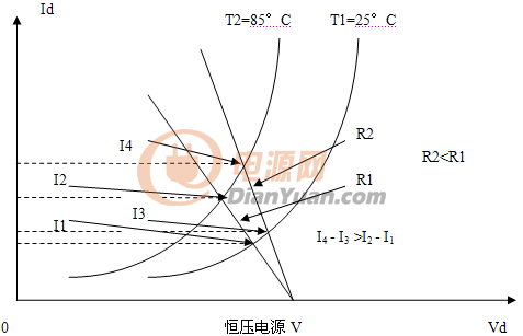 在常溫下是可以的,但在溫升以后就不能保持了。圖6中就顯示了這個問題,常溫下的LED伏安特性以實線表示,兩個LED的伏安特性在斜率上略有區別,在用恒壓電源Vo供電時,選用不同的電阻,可以得到同樣的正向電流Io。但是當溫度升高時,其伏安特性左移,如虛線所示。因為還是原來的恒壓和原來的電阻,此時的電流卻變成了I1和I2。不等于原來的Io了。