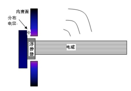 連接器作為一種透穿設備殼體的器件,如果和機殼搭接不良,就會把系統內部的干擾從機殼內部帶出來, 通過電纜輻射出去。 由于趨服效應, PCB 上的干擾源在機殼內表面上感應出象波濤一樣強烈的噪聲干擾電流/電壓, 只要機殼上面的縫隙不大于波長的 1/20, 我們認為這些干擾只存在機殼的內表面上。 如下圖所示, 如果連接器和機殼搭接不良, 在連接器的表面和機殼的內表面之間必定存在著較大的分布電容(因為距離很小) , 機殼內表面上的干擾很容易耦合到連接器上,通過連接器傳導出機殼,在電纜上造成對外輻射。