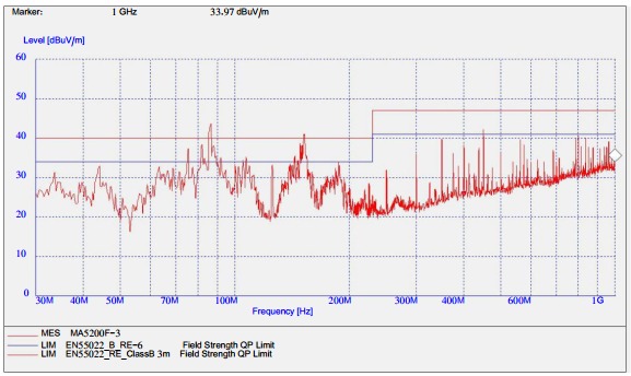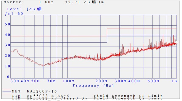 MA5200F 在進行 RE 測試時, 按照測試組網要求搭建環境, 機框前面板上連接各種業務線和調試用的控制線, 測試時發現輻射超標,在 70MHz~200MHz 之間輻射超標,超過限值線 4dB 左右,測試頻譜如下圖所示: