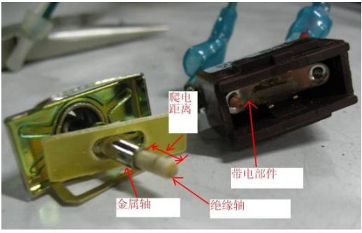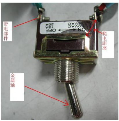 分析問(wèn)題 根據(jù)GB4706.1第8.2條 “II類(lèi)器具和II類(lèi)結(jié)構(gòu),其結(jié)構(gòu)和外殼對(duì)與基本絕緣以及僅用基本絕緣與帶電部件隔開(kāi)的金屬部件意外接觸應(yīng)有足夠的防護(hù)。只允許觸及到那些由雙重絕緣或由加強(qiáng)絕緣與帶電部件隔開(kāi)的部件。” 因?yàn)樵撜ブ瓩C(jī)為II類(lèi)器具,所以該電源適配器開(kāi)關(guān)的金屬軸如圖3所示,應(yīng)作為加強(qiáng)絕緣考慮。按照29.2.2的要求,金屬軸跟帶電部件之間的爬電距離應(yīng)大于8mm才符合要求。先不拆開(kāi)電源開(kāi)關(guān),從外部考核其爬電距離,如圖3所示,爬電距離大于8mm,似乎滿(mǎn)足標(biāo)準(zhǔn)要求。然后在金屬軸與帶電部件之間打3000V的耐壓,結(jié)果擊穿,分析原因后,估計(jì)是開(kāi)關(guān)內(nèi)部的爬電距離不夠,所以就把電源適配器開(kāi)關(guān)拆開(kāi),如圖4所示。分析其工作原理,開(kāi)關(guān)內(nèi)部有一帶電金屬片,金屬軸通過(guò)絕緣軸與該金屬片接觸,扳動(dòng)金屬軸,金屬片就會(huì)以翹板的形式實(shí)現(xiàn)接通和斷開(kāi)。所以,金屬軸與帶電件之間較短的爬電距離應(yīng)為該絕緣軸的長(zhǎng)度,如圖4所示。經(jīng)測(cè)量,該絕緣軸只有3mm左右,明顯不符合8mm的要求,所以該電源適配器開(kāi)關(guān)的金屬軸應(yīng)視為可觸及的帶電部件,不符合標(biāo)準(zhǔn)第8.2條的要求。同時(shí)也不滿(mǎn)足GB4706.1的第22.34,22.35條“操作旋鈕、手柄、操縱桿和類(lèi)似部件的軸不應(yīng)帶電…….”