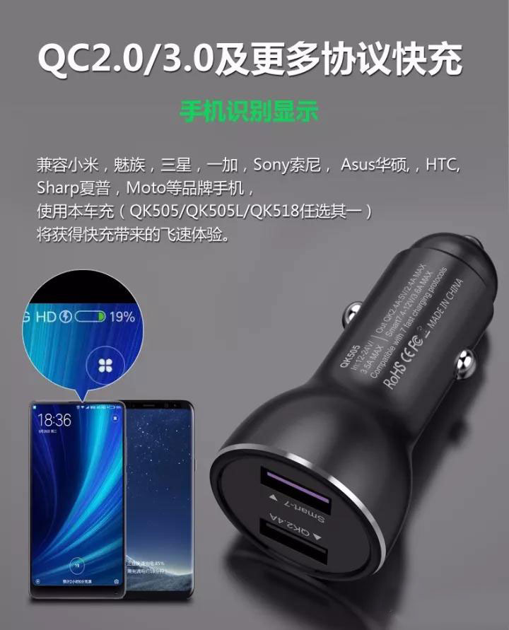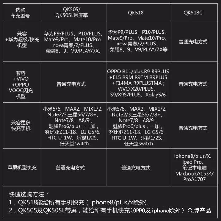 通俗適用性:QK505/QK505L支持給任何手機(jī)充電的同時(shí),如果手機(jī)支持快速充電功能它就支持給手機(jī)快速充電,但OPPO,VIVO,iphone8/PLUS/X除外。