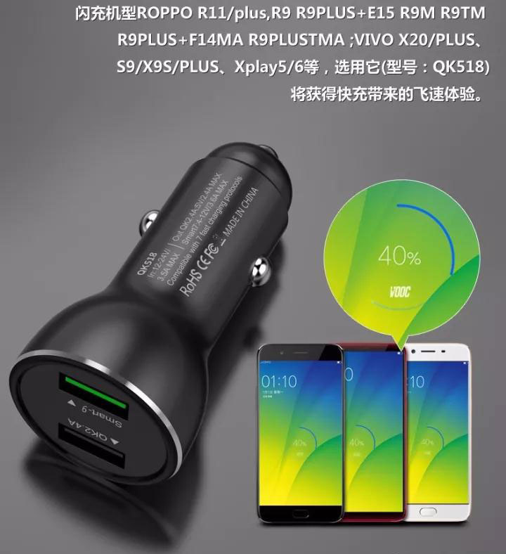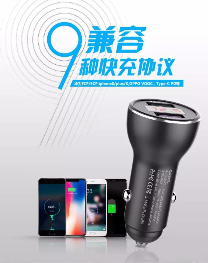 最新專利高品質(zhì)車載充電器兼容 華為P9/10 MATE 9/10超級快充 OPPIO VOOC閃充及QC3.0/2.0等9種充電協(xié)議的安卓系統(tǒng)全功能快充的車載充電器。其中型號QK518C Type-C接口版實(shí)現(xiàn)IPHONE8/X PD快速充電。