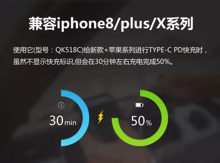 通俗適用性:QK518支持給任何手機(jī)充電的同時(shí),如果手機(jī)支持快速充電功能它還支持給手機(jī)快速充電,但iphone8/PLUS/X除外。